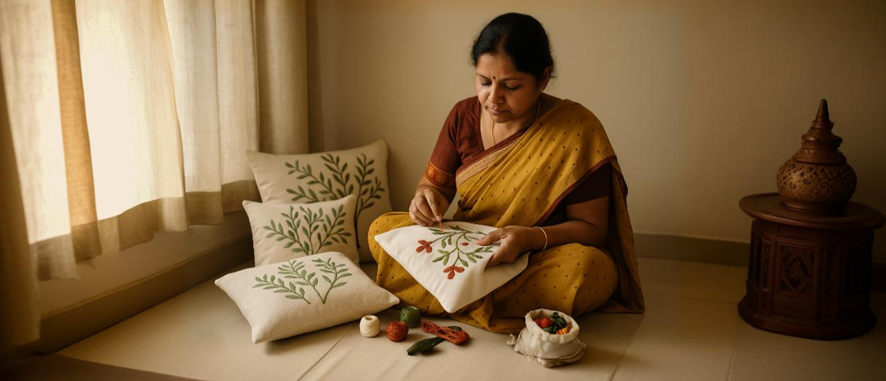 Our cushions feature hand embroidery using intricate thread work and time-honored stitches — made with patience, precision, and pure artistry.