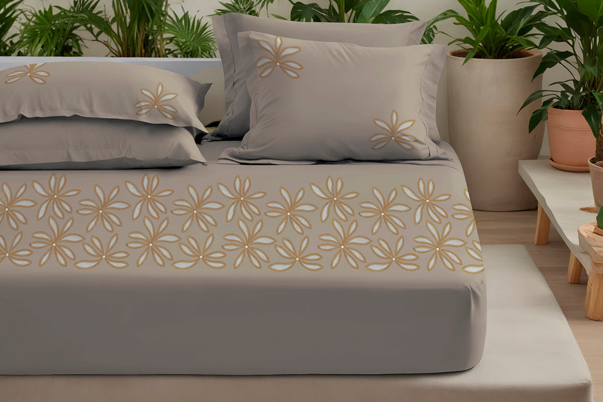 A soft canvas of solid hues, elevated with delicate embroidery and woven in 300 TC pure cotton sateen. Because your sanctuary deserves nothing less than art in its gentlest form.
