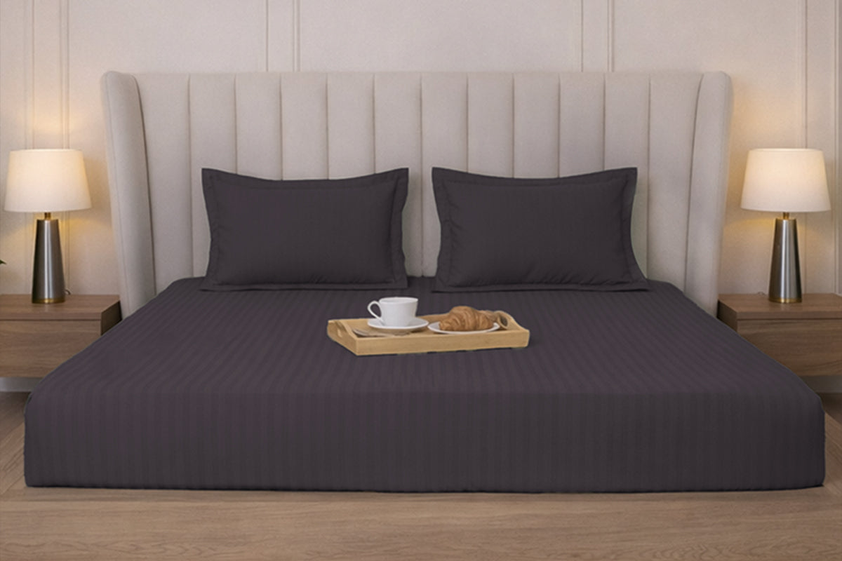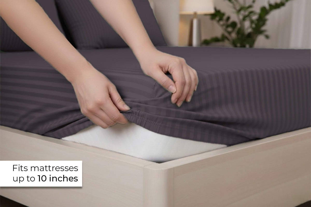 Granite Gray Pure Cotton Striped Fitted Bed Sheet 300 TC