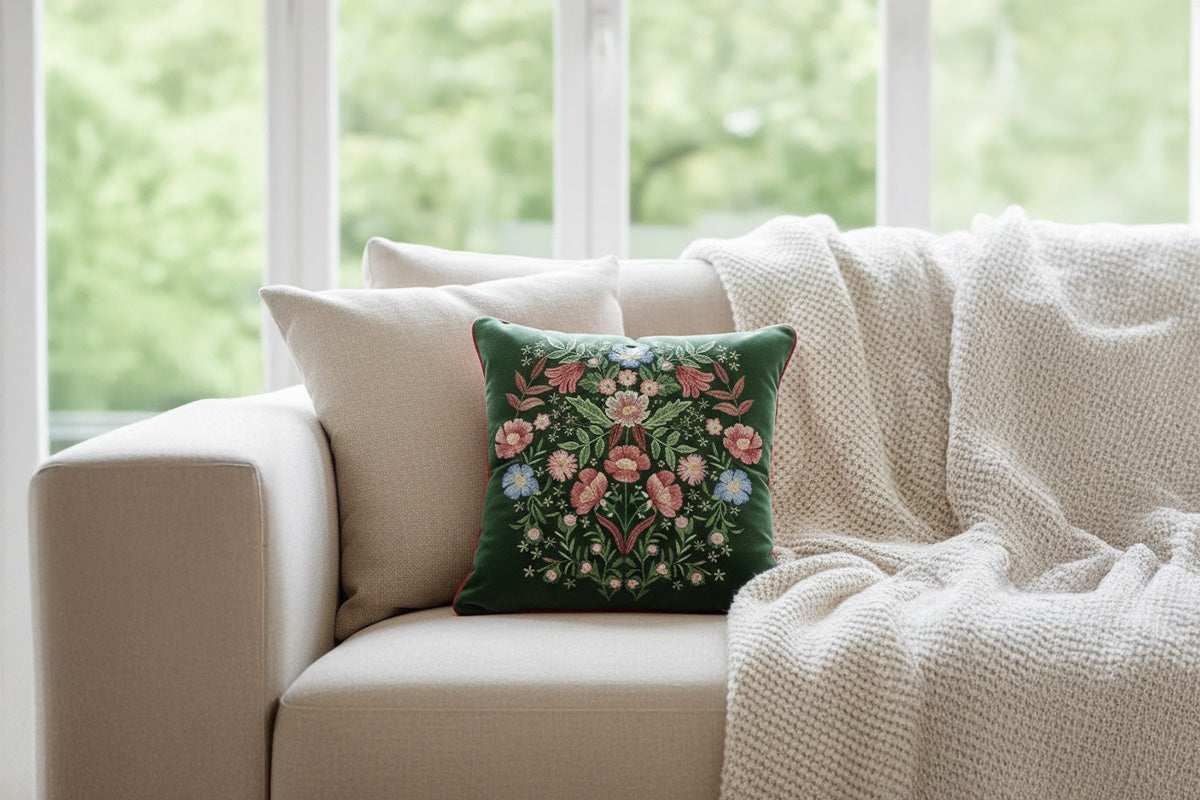Blooming Bagh Embroidered Cushion Cover – Forest Green (Set of 2)