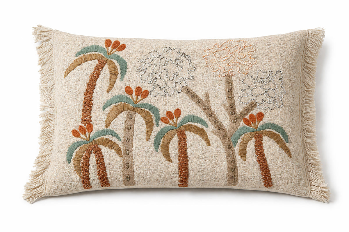 The Botanique Palms Cushion Cover is a handcrafted statement piece defined by depth, texture, and intricate detailing. Set on a heavy cotton slub fabric base, the design is brought to life through a layered mix of dori embroidery, woollen threadwork, metallic wire accents, and flat ribbon embroidery, creating a visually rich and tactile surface.