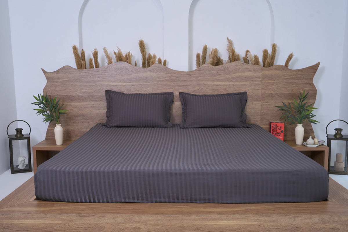 Granite Gray Pure Cotton Striped Fitted Bed Sheet 300 TC